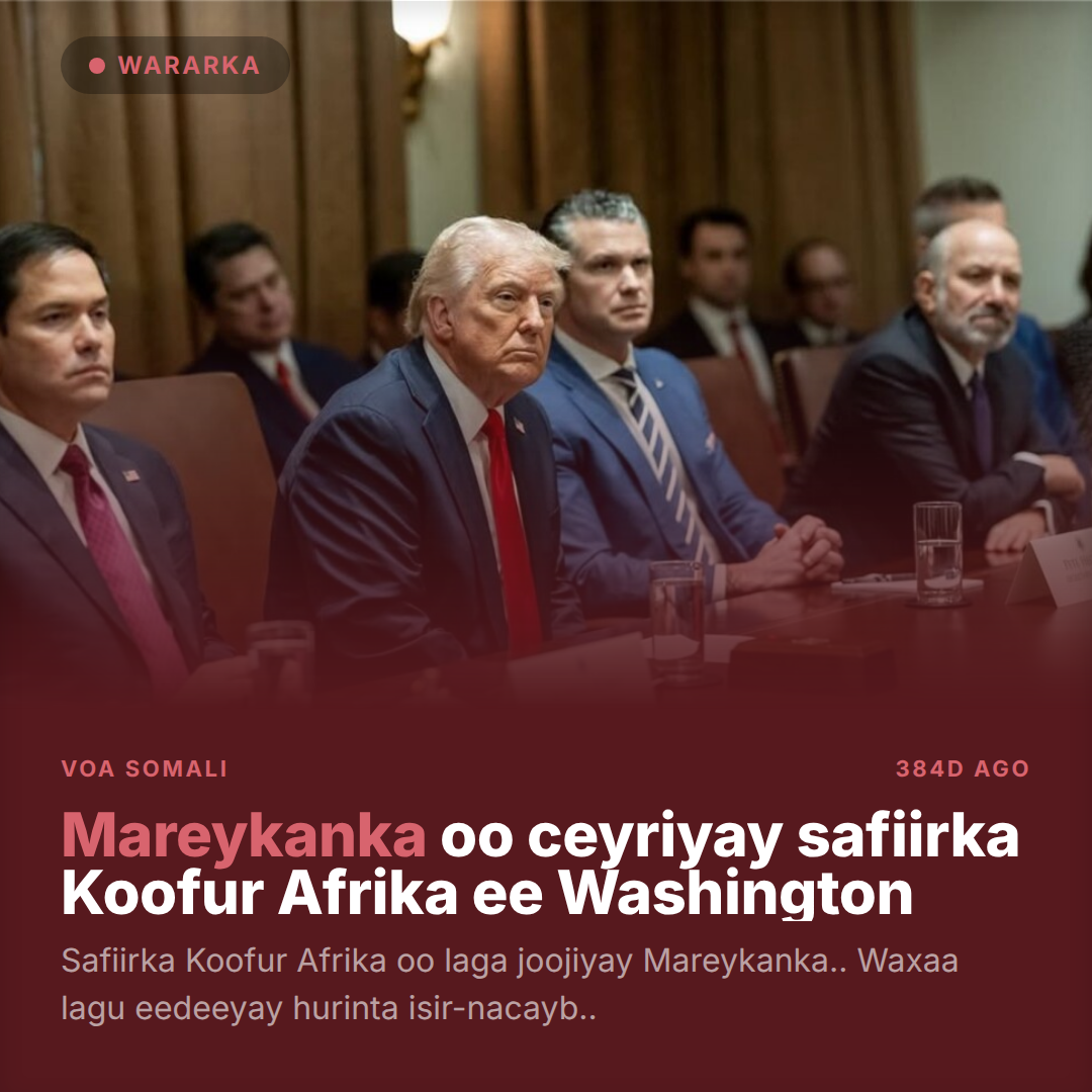 The sources are BBC Somali, VOA Somali, Hiiraan Online, SONNA, and Somali Digest. Stories get corroborated across outlets using Jaccard similarity on normalised Somali text — if only one outlet covers something, the pipeline skips it.